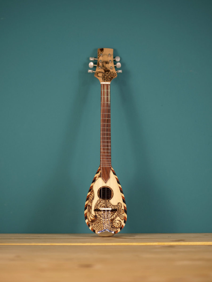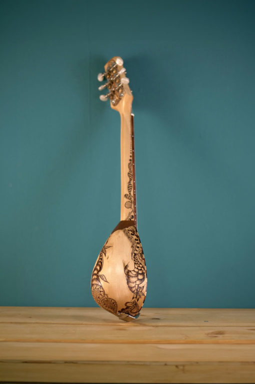 Furthermore, it is decorated with fire by the hands of a gifted Greek pyrography artist. There are detailed ornaments on almost every part of the instrument (soundboard, soundbox, neck, et cetera), inspired by the rich landscape and culture of Greece and Minor Asia.